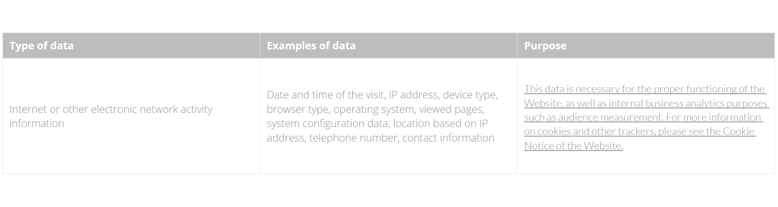 The Website also automatically collects the following data via cookies and other automatic collection technology:
