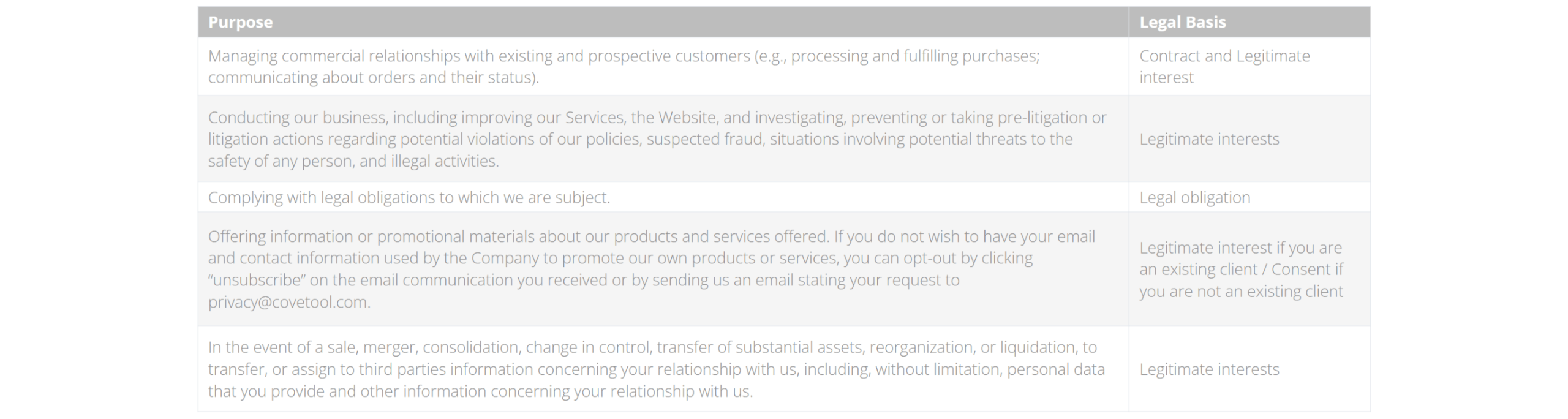 For questions or additional information regarding the purpose and legal basis for processing personal data, please contact us at privacy@cove.inc.